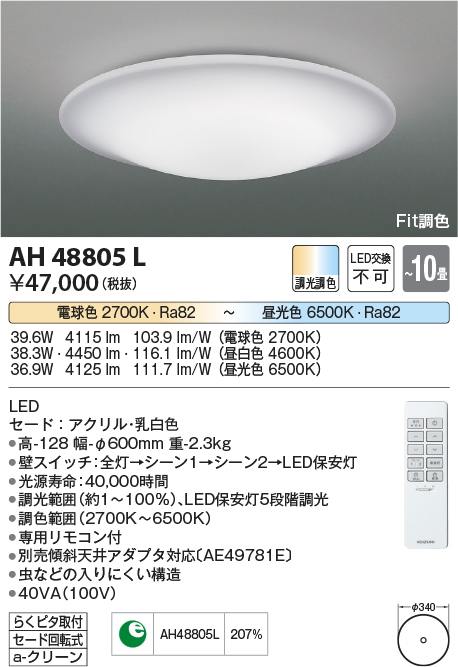 | 補足・注意事項 | ◆消費電力:38.3W ◆色温度:2700K~6500K ◆演色性:Ra82 ◆光源寿命:40,000時間 ◆調光範囲約1~100%、LED保安灯5段階調光 ◆調色範囲(2700K~6500K) ◆専用リモコン付 ◆別売傾斜天井アダプタ対応〔AE49781E〕 ◆虫などの入りにくい構造 |