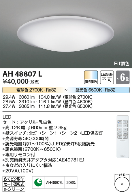 | 補足・注意事項 | ◆消費電力:28.5W ◆色温度:2700K~6500K ◆演色性:Ra82 ◆光源寿命:40,000時間 ◆調光範囲約1~100%、LED保安灯5段階調光 ◆調色範囲(2700K~6500K) ◆専用リモコン付 ◆別売傾斜天井アダプタ対応〔AE49781E〕 ◆虫などの入りにくい構造 |