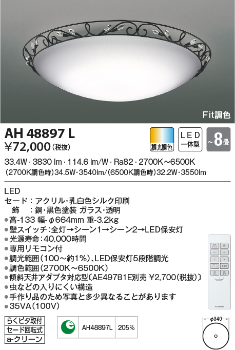 | 補足・注意事項 | ◆消費電力:33.4W ◆光束値:3830lm ◆35VA(100V) ◆色温度:2700K~6500K ◆演色性:Ra82 ◆光源寿命:40,000時間 ◆調光範囲(100~約1%)、LED保安灯5段階調光 ◆専用リモコン付 ◆調色範囲(2700K~6500K) ◆傾斜天井アダプタ対応型〔AE49781E別売 \2,700(税抜)〕 ◆虫などの入りにくい構造 ◆手作り品のため写真と多少異なることがあります ◆消費効率は4600K時 ※上記の数値は、4600K時の値です |