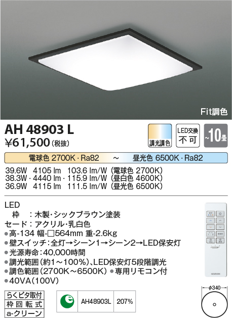 | 補足・注意事項 | ◆消費電力:38.3W ◆光束値:4440lm ◆40VA(100V) ◆色温度:2700K~6500K ◆演色性:Ra82 ◆光源寿命:40,000時間 ◆調光範囲約1~100%、LED保安灯5段階調光 ◆調色範囲(2700K~6500K) ◆専用リモコン付 ※上記の数値は、4600K時の値です |