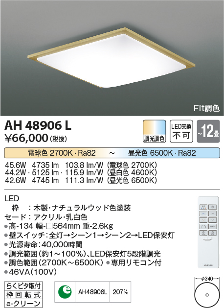 | 補足・注意事項 | ◆消費電力:44.2W ◆光束値:5125lm ◆46VA(100V) ◆色温度:2700K~6500K ◆演色性:Ra82 ◆光源寿命:40,000時間 ◆調光範囲約1~100%、LED保安灯5段階調光 ◆調色範囲(2700K~6500K) ◆専用リモコン付 ※上記の数値は、4600K時の値です |