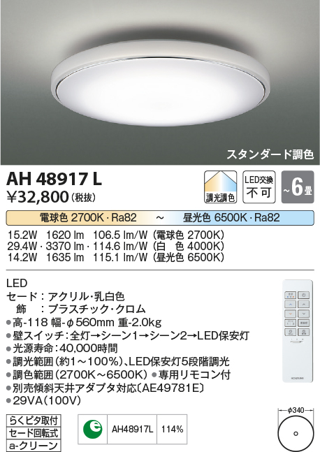 | 補足・注意事項 | ◆消費電力:29.4W ◆光束値:3370lm ◆29VA(100V) ◆色温度:2700K~6500K ◆演色性:Ra82 ◆光源寿命:40,000時間 ◆調光範囲約1~100%、LED保安灯5段階調光 ◆調色範囲(2700K~6500K) ◆専用リモコン付 ◆別売傾斜天井アダプタ対応〔AE49781E〕 ※上記の数値は、4000K時の値です |