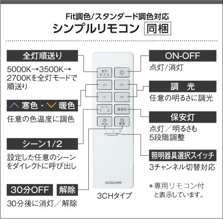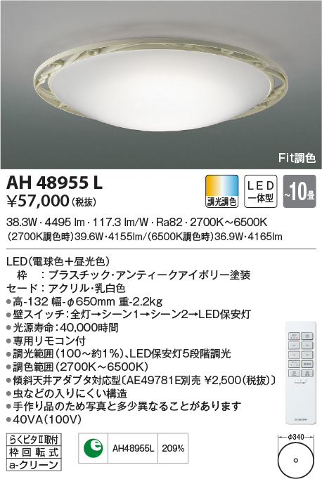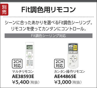 | 補足・注意事項 | ◆消費電力:38.3W ◆色温度:2700K~6500K ◆演色性:Ra82 ◆光源寿命:40,000時間 ◆専用リモコン付 ◆調光範囲(100~約1%)、LED保安灯5段階調光 ◆調色範囲(2700K~6500K) ◆傾斜天井アダプタ対応型〔AE49781E別売 \2,500(税抜)〕 ◆虫などの入りにくい構造 ◆手作り品のため写真と多少異なることがあります ◆(2700K調色時)39.6W・4155lm/(6500K調色時)36.9W・4165lm |