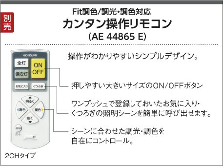 | 補足・注意事項 | ◆消費電力:33.4W ◆色温度:2700K~6500K ◆演色性:Ra82 ◆光源寿命:40,000時間 ◆専用リモコン付 ◆調光範囲(100~約1%)、LED保安灯5段階調光 ◆調色範囲(2700K~6500K) ◆傾斜天井アダプタ対応型〔AE49781E別売 \2,500(税抜)〕 ◆虫などの入りにくい構造 ◆手作り品のため写真と多少異なることがあります ◆(2700K調色時)34.5W・3625lm/(6500K調色時)32.2W・3635lm |