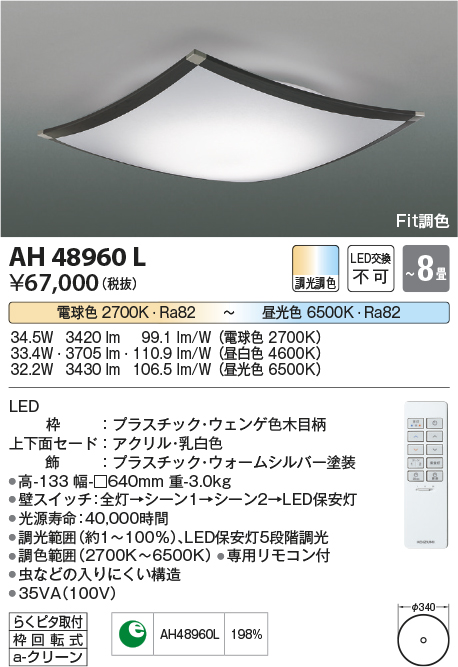 | 補足・注意事項 | ◆消費電力:33.4W ◆光束値:3705lm ◆35VA(100V) ◆色温度:2700K~6500K ◆演色性:Ra82 ◆光源寿命:40,000時間 ◆調光範囲約1~100%、LED保安灯5段階調光 ◆調色範囲(2700K~6500K) ◆専用リモコン付 ◆虫などの入りにくい構造 ◆(2700K調色時)34.5W・3420lm/(6500K調色時)32.2W・3430lm ※上記の数値は、4600K時の値です |