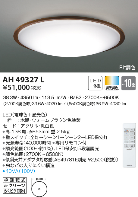 | 補足・注意事項 | ◆消費電力:38.3W ◆光束値:4350lm ◆40VA(100V) ◆色温度:2700K~6500K ◆演色性:Ra82 ◆光源寿命:40,000時間 ◆専用リモコン付 ◆調光範囲(100~約1%)、LED保安灯5段階調光 ◆調色範囲(2700K~6500K) ◆傾斜天井アダプタ対応型〔AE49781E別売 \2,500(税抜)〕 ◆虫などの入りにくい構造 ◆(2700K調色時)39.6W・4020 lm /( 6500K調色時)36.9W・4030 lm ※上記の数値は、2700K時の値です |