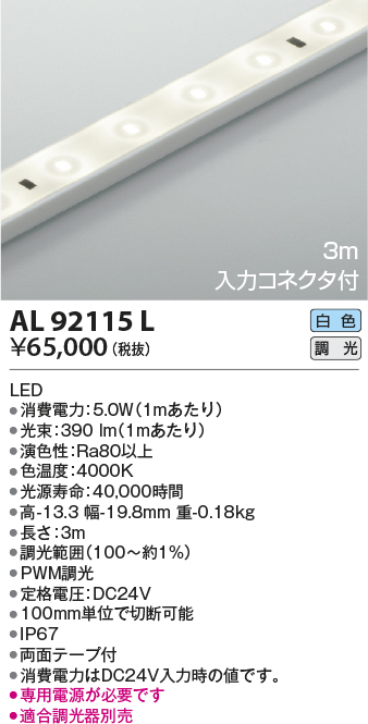 | 補足・注意事項 | ◆消費電力:15.0W ◆光束値:1170lm ◆色温度:4000K ◆演色性:Ra80 ◆光源寿命:40,000時間 ◆調光範囲(100~約1%) ◆消費電力:5.0W(1mあたり) ◆光束:390 lm(1mあたり) ◆演色性:Ra80以上 ◆100mm単位で切断可能 ◆定格電圧:DC24V ◆消費電力はDC24V入力時の値です ◆IP67 ◆両面テープ付 ◆適合調光器別売 ◆別売専用電源が必要です |