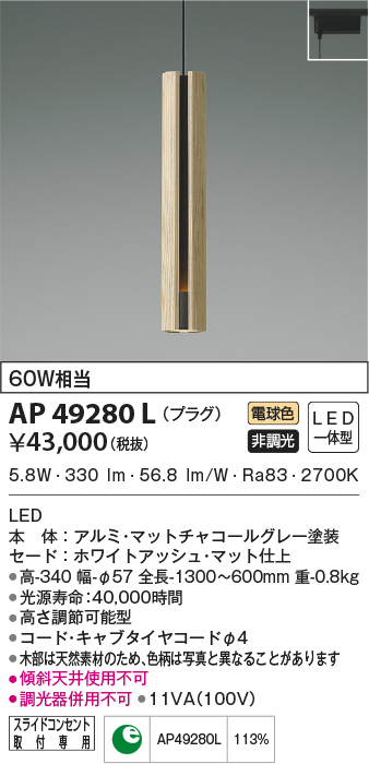 | 補足・注意事項 | ◆消費電力:5.8W ◆光束値:330lm ◆11VA(100V) ◆色温度:2700K ◆演色性:Ra83 ◆光源寿命:40,000時間 ◆高さ調節可能型 ◆コード・キャブタイヤコードφ4 ◆木部は天然素材のため、色柄は写真と異なることがあります ◆傾斜天井使用不可 |
