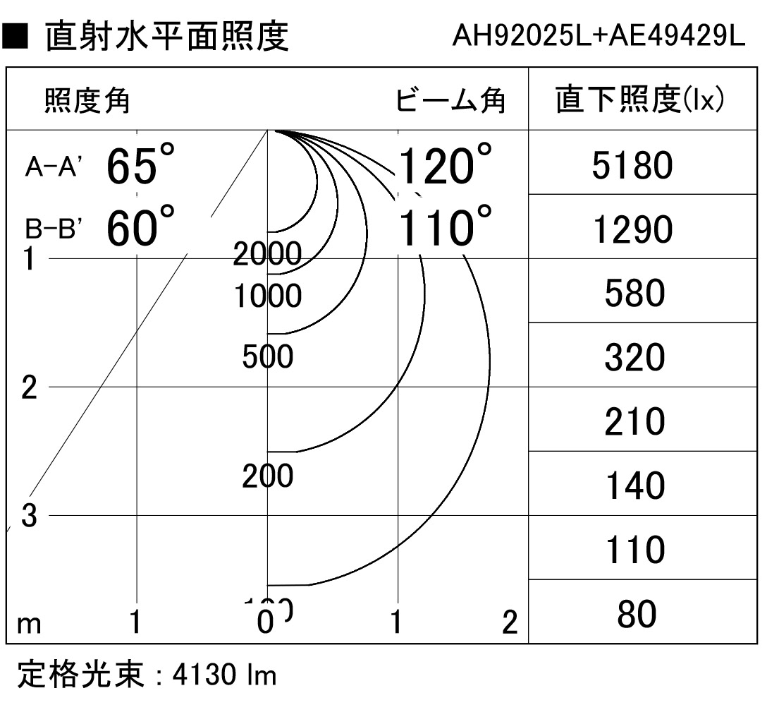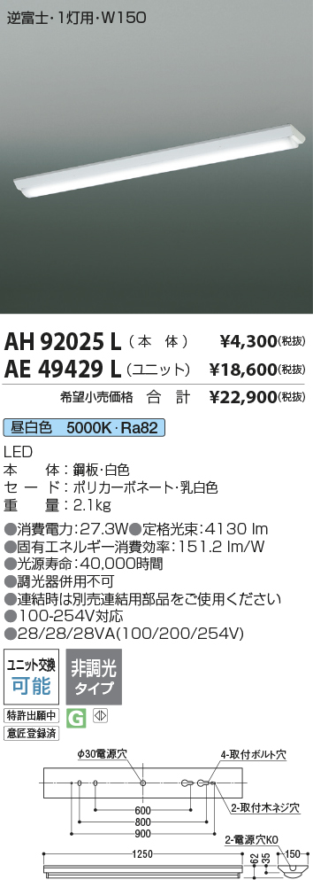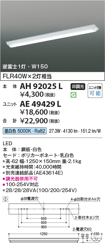 | 補足・注意事項 | ◆消費電力:27.3W ◆光束値:4130lm ◆28/28/28VA(100/200/254V) ◆色温度:5000K ◆演色性:Ra82 ◆光束維持時間:40,000時間 ◆別売連結部品(AE43614E) ◆調光器併用不可 |