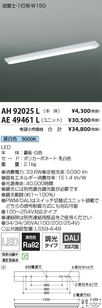 | 補足・注意事項 | ◆消費電力:33.6W ◆光束値:5090lm ◆34/34/36VA(100/200/254V) ◆色温度:5000K ◆演色性:Ra82 ◆光源寿命:40,000時間 ◆調光範囲(約1~100%) ◆PWM/DALIはスイッチ切替式ユニット搭載でどちらの信号制御方式にも対応可能 ◆連結時は別売連結用部品をご使用ください ◆公共施設型番:LSS9-4-48 ◆適合調光器別売 ※100-254V対応 |