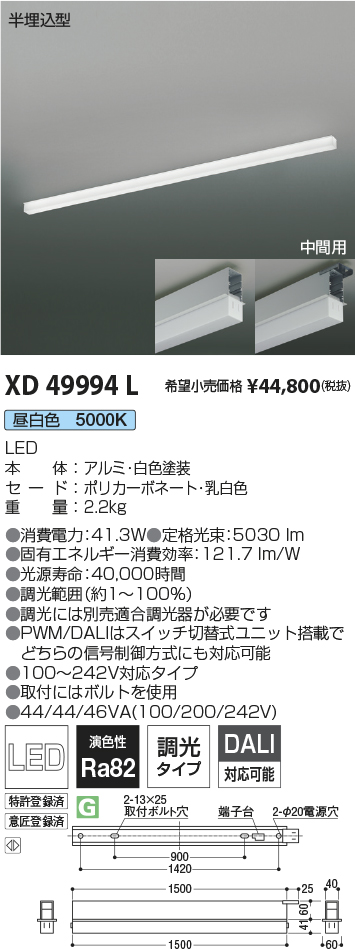 | 補足・注意事項 | ◆消費電力:41.3W ◆光束値:5030lm ◆44/44/46VA(100/200/242V) ◆色温度:5000K ◆演色性:Ra82 ◆光源寿命:40,000時間 ◆調光範囲(約1~100%) ◆PWM/DALIはスイッチ切替式ユニット搭載でどちらの信号制御方式にも対応可能 ◆適合調光器別売 ◆取付にはボルトを使用 ※100-242V対応 |