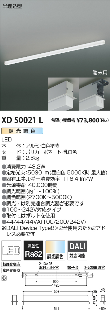 | 補足・注意事項 | ◆消費電力:43.2W ◆光束値:4190lm ◆44/44/44VA(100/200/242V) ◆色温度:2700K~5000K ◆演色性:Ra82 ◆光源寿命:40,000時間 ◆調光範囲(約1~100%) ◆調色範囲(2700K~5000K) ◆調光調色には別売適合調光器が必要です ◆取付にはボルトを使用 ※100-242V対応 ※DALI Device Type8×2台使用のため2アドレス必要です ※上記の数値は、2700K時の値です |