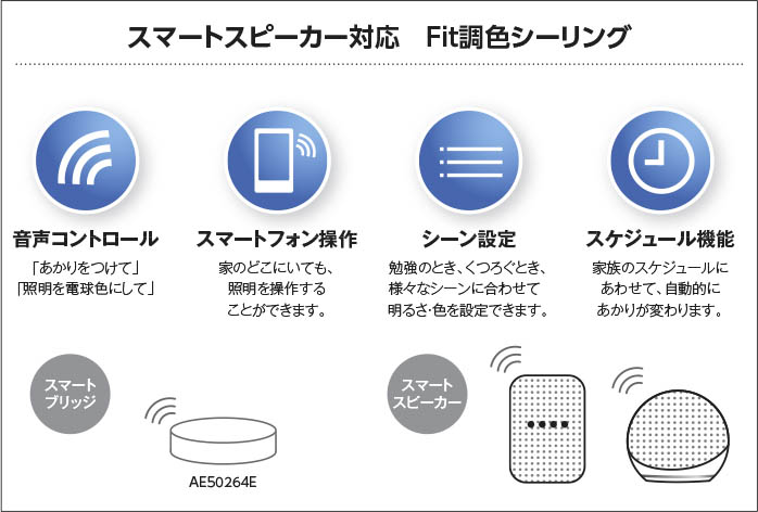 | 補足・注意事項 | ◆消費電力:29.0W ◆色温度:2700K~6500K ◆演色性:Ra82 ◆光源寿命:40,000時間 ◆専用リモコン付 ◆調光範囲(100~約1%)、LED保安灯5段階調光 ◆調色範囲(2700K~6500K) ◆傾斜天井アダプタ対応型〔AE49781E別売 \2,500(税抜)〕 ◆虫などの入りにくい構造 ◆別売スマートブリッジ〔AE50264E \39,800(税抜)〕 ◆(2700K調色時)29.9W・2970 lm /(6500K調色時)28.1W・2980 lm ◆スマートスピーカーとの連動には別売スマートブリッジが必要です |