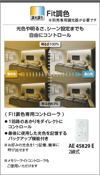 | 補足・注意事項 | ◆消費電力:29.0W ◆色温度:2700K~6500K ◆演色性:Ra82 ◆光源寿命:40,000時間 ◆専用リモコン付 ◆調光範囲(100~約1%)、LED保安灯5段階調光 ◆調色範囲(2700K~6500K) ◆傾斜天井アダプタ対応型〔AE49781E別売 \2,500(税抜)〕 ◆別売スマートブリッジ〔AE50264E \39,800(税抜)〕 ◆(2700K調色時)29.9W・3175 lm /(6500K調色時)27.9W・3185 lm ◆スマートスピーカーとの連動には別売スマートブリッジが必要です |