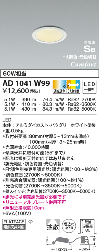 | 補足・注意事項 | ◆消費電力:5.1W ◆光束値:390lm ◆6VA(100V) ◆色温度:2700K|3500K|5000K ◆演色性:Ra82 ◆光源寿命:40,000時間 ◆取付必要高:80mm(材厚5~13mm未満時)100mm(材厚13~25mm時) ◆配光は傾斜天井対応ではありません ◆調光範囲・調色範囲・光色切替 Fit調色別売専用調光器:調光範囲(100~約3%)・調色範囲(2700K~5000K) 別売適合調光器:調光範囲(100~約1%)・光色切替(2700K→3500K→5000K) 壁スイッチ:光色切替(2700K→3500K→5000K) ◆適合調光器別売 ◆リニューアルプレート併用不可 ◆照射近接限度10cm ※上記の数値は、2700K時の値です |
