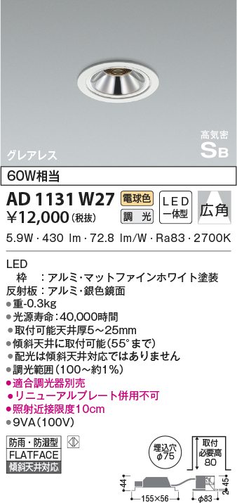 補足・注意事項 | ◆消費電力:5.9W ◆色温度:2700K ◆演色性:Ra83 ◆光源寿命:40,000時間 ◆取付可能天井厚5~25mm ◆傾斜天井に取付可能(55°まで) ◆配光は傾斜天井対応ではありません ◆調光範囲(100~約1%) ◆適合調光器別売 ◆リニューアルプレート併用不可 ◆照射近接限度10cm |