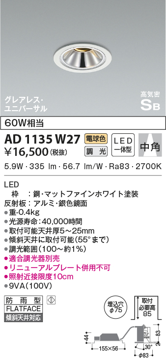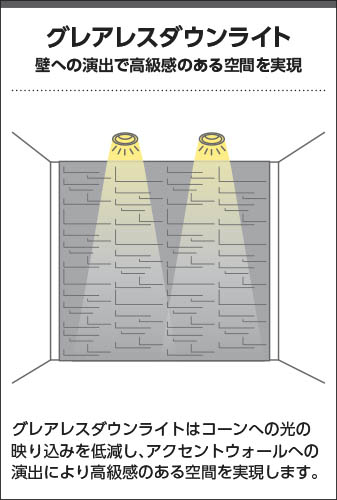 補足・注意事項 | ◆消費電力:5.9W ◆色温度:2700K ◆演色性:Ra83 ◆光源寿命:40,000時間 ◆取付可能天井厚5~25mm ◆傾斜天井に取付可能(55°まで) ◆調光範囲(100~約1%) ◆適合調光器別売 ◆リニューアルプレート併用不可 ◆照射近接限度10cm |