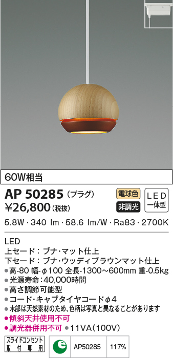 | 補足・注意事項 | ◆消費電力:5.8W ◆光束値:340lm ◆11VA(100V) ◆色温度:2700K ◆演色性:Ra83 ◆光源寿命:40,000時間 ◆高さ調節可能型 ◆コード・キャブタイヤコードφ4 ◆木部は天然素材のため、色柄は写真と異なることがあります ◆調光器併用不可 ◆傾斜天井使用不可 |