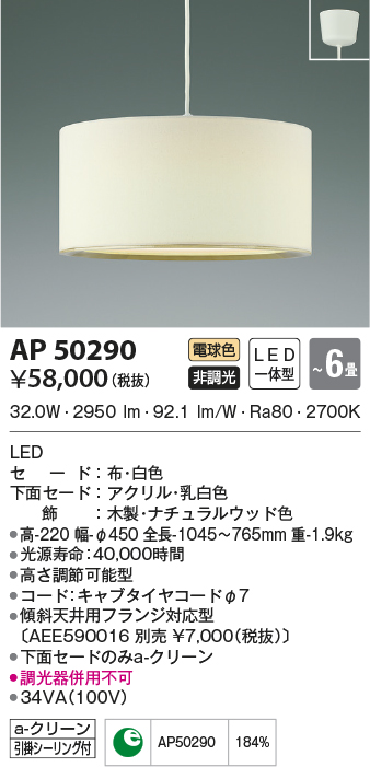| 補足・注意事項 | ◆消費電力:32.0W ◆色温度:2700K ◆演色性:Ra80 ◆光源寿命:40,000時間 ◆高さ調節可能型 ◆コード:キャブタイヤコードφ7 ◆傾斜天井用フランジ対応型〔AEE590016 別売 \7,000(税抜)〕 ◆下面セードのみa-クリーン ◆調光器併用不可 |