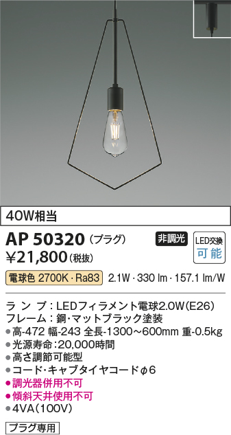 | 補足・注意事項 | ◆消費電力:2.1W ◆光束値:330lm ◆4VA(100V) ◆色温度:2700K ◆演色性:Ra83 ◆光源寿命:20,000時間 ◆高さ調節可能型 ◆コード・キャブタイヤコードφ6 ◆調光器併用不可 ◆傾斜天井使用不可 |
