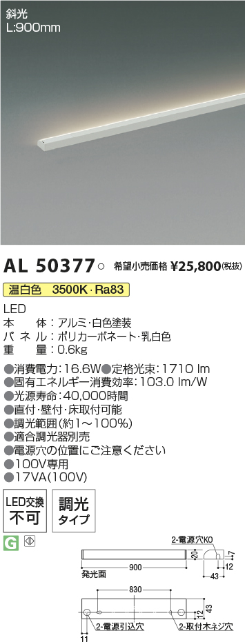 | 補足・注意事項 | ◆消費電力:16.6W ◆光束値:1710lm ◆17VA(100V) ◆色温度:3500K ◆演色性:Ra83 ◆光束維持時間:40,000時間 ◆調光範囲約1~100% ◆適合調光器別売 ◆電源穴の位置にご注意ください |