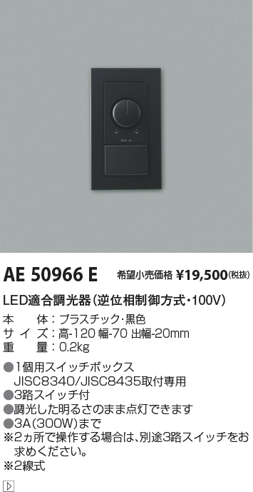 | 補足・注意事項 | ◆1個用スイッチボックスJISC8340/JISC8435取付専用 ◆3路スイッチ付 ◆調光した明るさのまま点灯できます ◆3A(300VA)まで ※2ヵ所で操作する場合は、別途3路スイッチをお求めください ※2線式 |