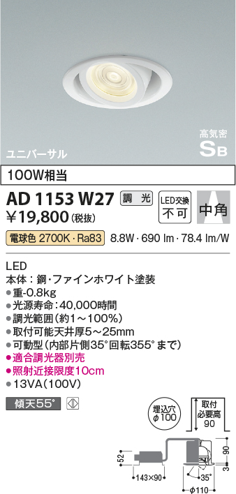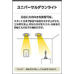 | 補足・注意事項 | ◆消費電力:8.8W ◆光束値:690lm ◆13VA(100V) ◆色温度:2700K ◆演色性:Ra83 ◆光源寿命:40,000時間 ◆調光範囲約1~100% ◆取付可能天井厚5~25mm ◆可動型(内部片側35°回転355°まで) ◆適合調光器別売 ◆照射近接限度10cm |