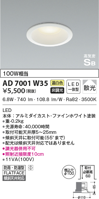 | 補足・注意事項 | ◆消費電力:6.8W ◆色温度:3500K ◆演色性:Ra82 ◆光源寿命:40,000時間 ◆取付可能天井厚5~25mm ◆傾斜天井に取付可能(55°まで) ◆配光は傾斜天井対応ではありません ◆調光器併用不可 ◆照射近接限度10cm |