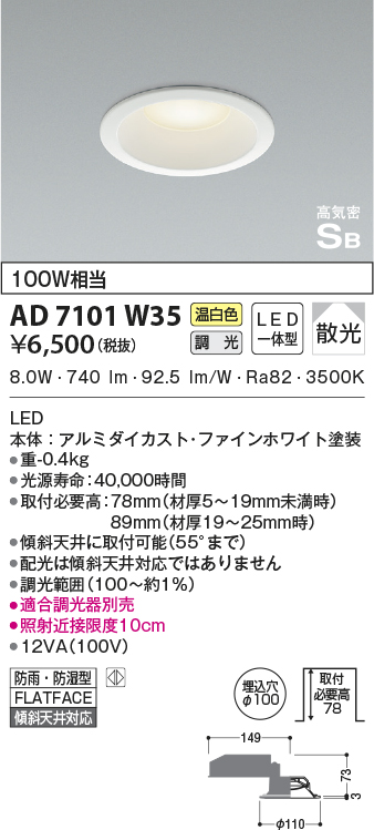 | 補足・注意事項 | ◆消費電力:8.0W ◆光束値:740lm ◆12VA(100V) ◆色温度:3500K ◆演色性:Ra82 ◆光源寿命:40,000時間 ◆取付必要高:78mm(材厚5~19mm未満時)89mm(材厚19~25mm時) ◆傾斜天井に取付可能(55°まで) ◆配光は傾斜天井対応ではありません ◆調光範囲(100~約1%) ◆適合調光器別売 ◆照射近接限度10cm |