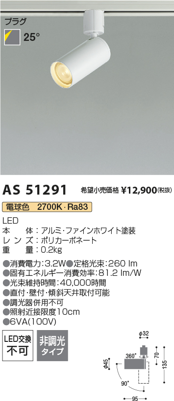 | 補足・注意事項 | ◆消費電力:3.2W ◆光束値:260lm ◆6VA(100V) ◆色温度:2700K ◆演色性:Ra83 ◆光束維持時間:40,000時間 ◆照射近接限度10cm ◆調光器併用不可 |