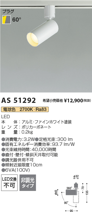 | 補足・注意事項 | ◆消費電力:3.2W ◆光束値:300lm ◆6VA(100V) ◆色温度:2700K ◆演色性:Ra83 ◆光束維持時間:40,000時間 ◆照射近接限度10cm ◆調光器併用不可 |
