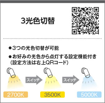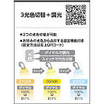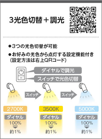 | 補足・注意事項 | ◆消費電力:8.1W ◆光束値:655lm ◆9VA(100V) ◆色温度:2700K|3500K|5000K ◆演色性:Ra82 ◆光束維持時間:40,000時間 ◆調光範囲・調色範囲・光色切替 Fit調色別売専用調光器:調光範囲(約3~100%)・調色範囲(2700K~5000K) 別売適合調光器:調光範囲(約1~100%)・光色切替(2700K→3500K→5000K) 壁スイッチ:光色切替(2700K→3500K→5000K) ◆照射近接限度10cm ◆調光調色、調光には別売調光器が必要です ※上記の数値は、2700K時の値です |