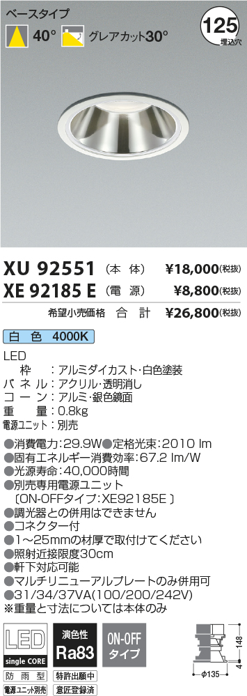 | 補足・注意事項 | ◆消費電力:29.9W ◆光束値:2010lm ◆31/34/37VA(100/200/242V) ◆色温度:4000K ◆演色性:Ra83 ◆光源寿命:40,000時間 ◆別売専用電源ユニット〔ON-OFFタイプ:XE92185E \8,000(税抜)〕 ◆調光器との併用はできません ◆コネクター付 ◆1~25mmの材厚で取付けてください ◆照射近接限度30cm ◆軒下対応可能 ◆マルチリニューアルプレートのみ併用可 ※重量と寸法については本体のみ |