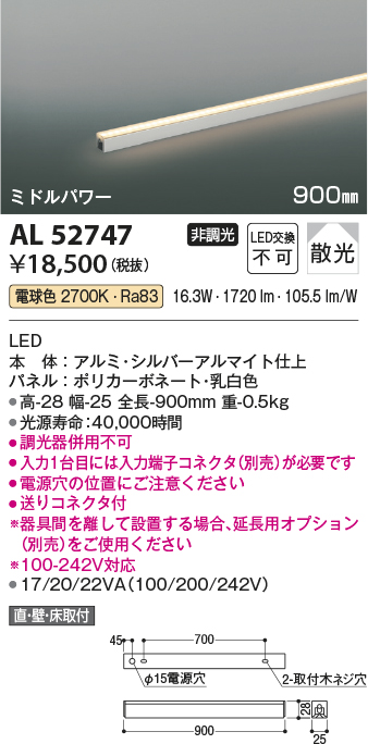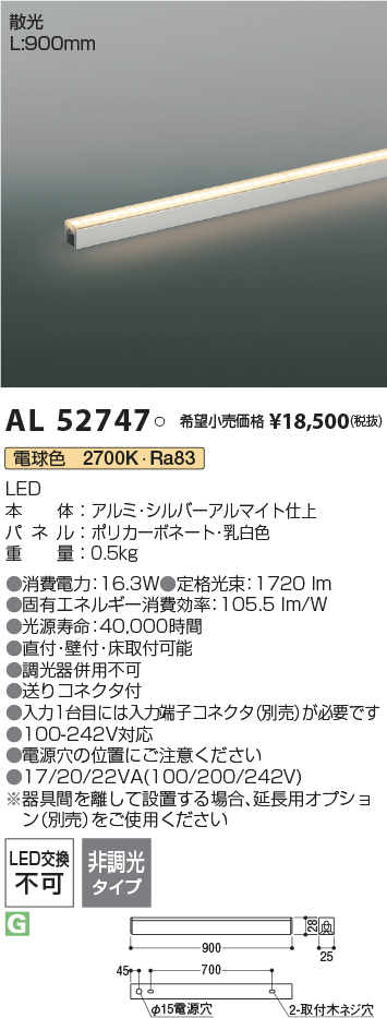 | 補足・注意事項 | ◆消費電力:16.3W ◆光束値:1720lm ◆17/20/22VA(100/200/242V) ◆色温度:2700K ◆演色性:Ra83 ◆光源寿命:40,000時間 ◆調光器併用不可 ◆入力1台目には入力端子コネクタ(別売)が必要です ◆電源穴の位置にご注意ください ◆送りコネクタ付 ※器具間を離して設置する場合、延長用オプション(別売)をご使用ください |