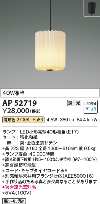 | 補足・注意事項 | ◆消費電力:4.5W ◆光束値:380lm ◆5VA(100V) ◆色温度:2700K ◆演色性:Ra83 ◆ランプ寿命:40,000時間 ◆調光範囲正位相 約5~100%、逆位相 約7~100% ◆高さ調節可能型 ◆コード・キャブタイヤコードφ6 ◆別売傾斜天井用フランジ対応(AEE590016) ◆手作り品のため写真と多少異なることがあります ◆適合調光器別売 |