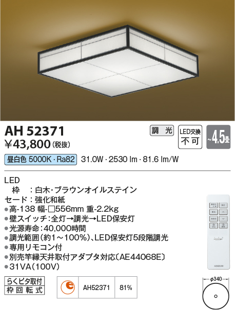 | 補足・注意事項 | ◆消費電力:31.0W ◆光束値:2530lm ◆31VA(100V) ◆色温度:5000K ◆演色性:Ra82 ◆光源寿命:40,000時間 ◆調光範囲約1~100%、LED保安灯5段階調光 ◆専用リモコン付 ◆別売竿縁天井取付アダプタ対応〔AE44068E〕 |