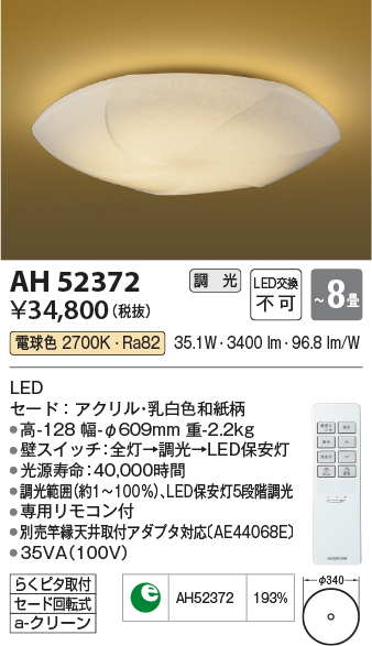 | 補足・注意事項 | ◆消費電力:35.1W ◆色温度:2700K ◆演色性:Ra82 ◆光源寿命:40,000時間 ◆調光範囲約1~100%、LED保安灯5段階調光 ◆専用リモコン付 ◆別売竿縁天井取付アダプタ対応〔AE44068E〕 |