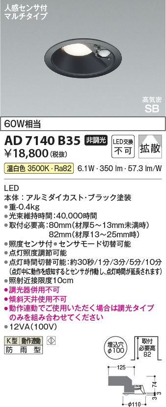 | 補足・注意事項 | ◆消費電力:6.1W ◆光束値:350lm ◆12VA(100V) ◆色温度:3500K ◆演色性:Ra82 ◆光束維持時間:40,000時間 ◆照度センサ付 ◆センサモード切替可能 ◆点灯照度調節可能 ◆点灯時間切替可能:約30秒/1分/3分/5分/10分(点灯中に動作を感知するとセンサが作動し、点灯時間が延長されます) ◆取付必要高:80mm(材厚5~13mm未満時)82mm(材厚13~25mm時) ◆照射近接限度10cm ◆調光器併用不可 ◆動作連動でご使用いただく場合は調光タイプのみを組み合わせてください ◆傾斜天井使用不可 |