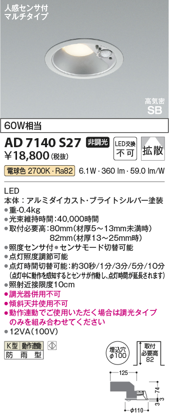 | 補足・注意事項 | ◆消費電力:6.1W ◆光束値:360lm ◆12VA(100V) ◆色温度:2700K ◆演色性:Ra82 ◆光束維持時間:40,000時間 ◆照度センサ付 ◆センサモード切替可能 ◆点灯照度調節可能 ◆点灯時間切替可能:約30秒/1分/3分/5分/10分(点灯中に動作を感知するとセンサが作動し、点灯時間が延長されます) ◆取付必要高:80mm(材厚5~13mm未満時)82mm(材厚13~25mm時) ◆照射近接限度10cm ◆調光器併用不可 ◆動作連動でご使用いただく場合は調光タイプのみを組み合わせてください ◆傾斜天井使用不可 |