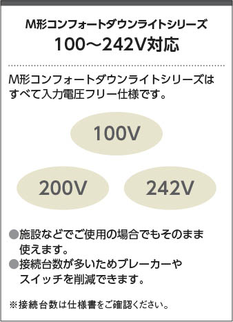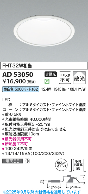 | 補足・注意事項 | ◆消費電力:12.4W ◆光束値:1345lm ◆13/14/15VA(100/200/242V) ◆色温度:5000K ◆演色性:Ra82 ◆光束維持時間:40,000時間 ◆取付可能天井厚5~25mm ◆照射近接限度10cm ◆配光は傾斜天井対応ではありません ◆調光器併用不可 |