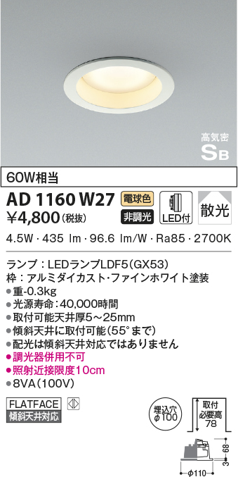 | 補足・注意事項 | ◆消費電力:4.5W ◆光束値:435lm ◆8VA(100V) ◆色温度:2700K ◆演色性:Ra85 ◆光源寿命:40,000時間 ◆取付可能天井厚5~25mm ◆配光は傾斜天井対応ではありません ◆調光器併用不可 ◆照射近接限度10cm |
