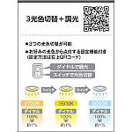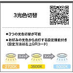| 補足・注意事項 | ◆消費電力:5.1W ◆光束値:485lm ◆6VA(100V) ◆色温度:2700K|3500K|5000K ◆演色性:Ra93 ◆光束維持時間:40,000時間 ◆調光範囲・調色範囲・光色切替 Fit調色別売専用調光器:調光範囲(約3~100%)・調色範囲(2700K~5000K) 別売適合調光器:調光範囲(約1~100%)・光色切替(2700K→3500K→5000K) 壁スイッチ:光色切替(2700K→3500K→5000K) ◆取付必要高:78mm(材厚5~13mm未満時)89mm(材厚13~25mm時) ◆配光は傾斜天井対応ではありません ◆照射近接限度10cm ◆調光調色、調光には別売調光器が必要です ※上記の数値は、2700K時の値です |