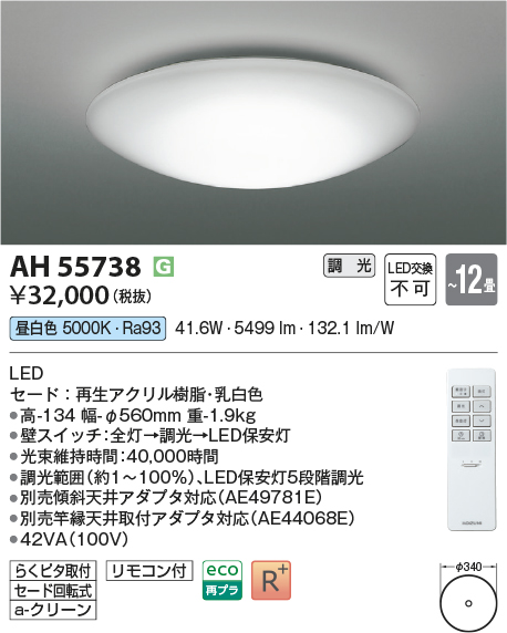 | 補足・注意事項 | ◆消費電力:41.6W ◆光束値:5499lm ◆42VA(100V) ◆色温度:5000K ◆演色性:Ra93 ◆光束維持時間:40,000時間 ◆調光範囲約1~100%、LED保安灯5段階調光 ◆別売傾斜天井アダプタ対応(AE49781E) ◆別売竿縁天井取付アダプタ対応(AE44068E) |