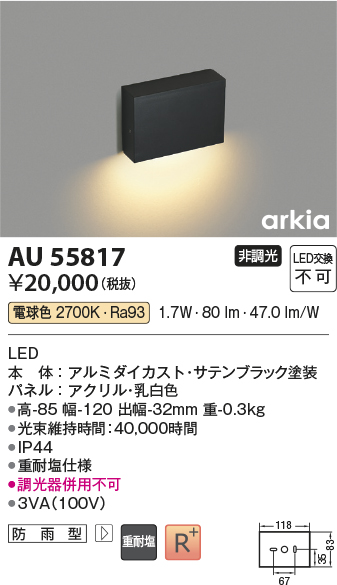 | 補足・注意事項 | ◆消費電力:1.7W ◆光束値:80lm ◆3VA(100V) ◆色温度:2700K ◆演色性:Ra93 ◆光束維持時間:40,000時間 ◆調光器併用不可 |