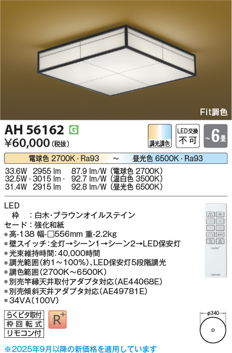 | 補足・注意事項 | ◆消費電力:32.5W ◆光束値:3015lm ◆34VA(100V) ◆色温度:2700K~6500K ◆演色性:Ra93 ◆光束維持時間:40,000時間 ◆調光範囲約1~100%、LED保安灯5段階調光 ◆調色範囲(2700K~6500K) ◆別売竿縁天井取付アダプタ対応(AE44068E) ◆別売傾斜天井アダプタ対応(AE49781E) ※上記の数値は、3500K時の値です |