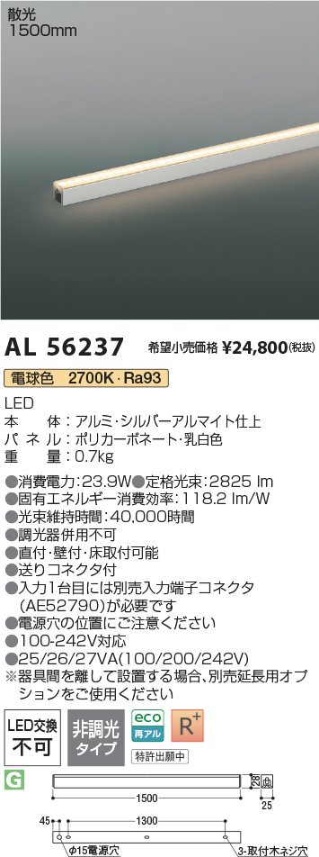 | 補足・注意事項 | ◆消費電力:23.9W ◆光束値:2825lm ◆25/26/27VA(100/200/242V) ◆色温度:2700K ◆演色性:Ra93 ◆光束維持時間:40,000時間 ◆器具間を離して設置する場合、別売延長用オプションをご使用ください ◆調光器併用不可 ◆送りコネクタ付 ◆入力1台目には別売入力端子コネクタ(AE52790)が必要です ◆電源穴の位置にご注意ください |