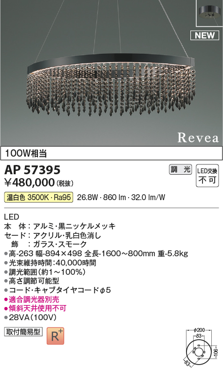 | 補足・注意事項 | ◆消費電力:26.8W ◆光束値:860lm ◆28VA(100V) ◆色温度:3500K ◆演色性:Ra95 ◆光束維持時間:40,000時間 ◆調光範囲約1~100% ◆高さ調節可能型 ◆コード・キャブタイヤコードφ5 ◆適合調光器別売 ◆傾斜天井使用不可 |