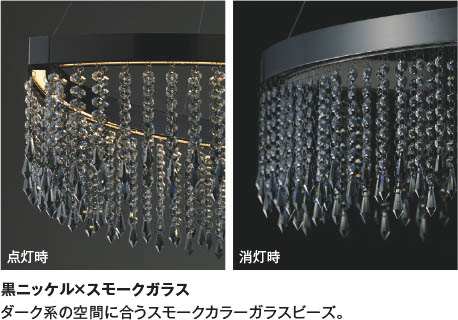 | 部位・材質・色・仕上げ | 本体:アルミ・黒ニッケルメッキ セード:アクリル・乳白色消し 飾:ガラス・スモーク |