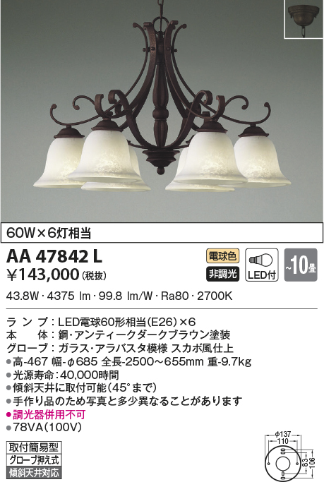 | 補足・注意事項 | ◆消費電力:43.8W ◆光束値:4375lm ◆78VA(100V) ◆色温度:2700K ◆演色性:Ra80 ◆光源寿命:40,000時間 ◆手作り品のため写真と多少異なることがあります ◆調光器併用不可 |