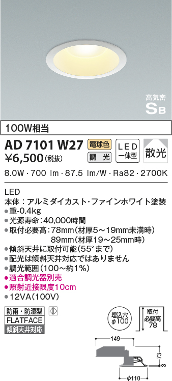 | 補足・注意事項 | ◆消費電力:8.0W ◆光束値:700lm ◆12VA(100V) ◆色温度:2700K ◆演色性:Ra82 ◆光源寿命:40,000時間 ◆取付必要高:78mm(材厚5~19mm未満時)89mm(材厚19~25mm時) ◆傾斜天井に取付可能(55°まで) ◆配光は傾斜天井対応ではありません ◆調光範囲(100~約1%) ◆適合調光器別売 ◆照射近接限度10cm |